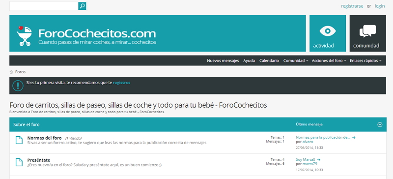 Llevo bastante tiempo con la idea en la cabeza de abrir un foro en el que poder debatir sobre todo aquello relacionado con los análisis de cochecitos de bebé que hacemos en este blog, pues bien, resulta que ese foro ya existe y creo que puede llegar a ser bastante útil para todos los futuros papás. Se trata de forocochecitos.com, lleva muy poco tiempo, pero me gusta bastante la estructura que Álvaro, su creador, le ha dado, ya que abarca prácticamente todo lo que unos padres primerizos pueden necesitar.